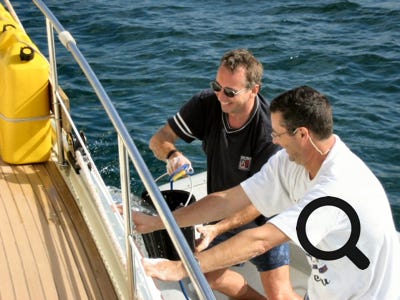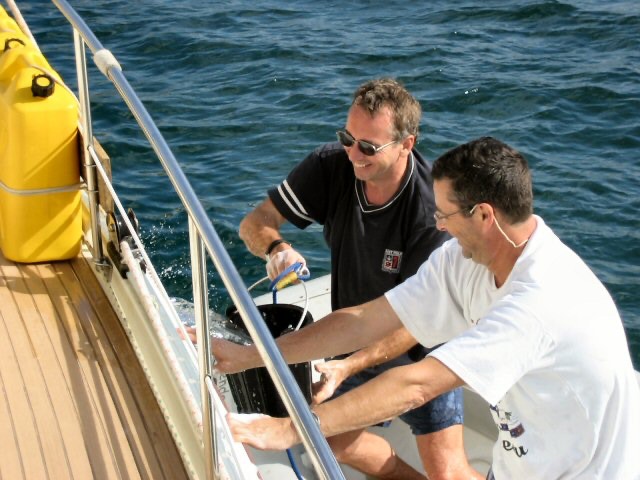 Un des meilleurs services de la transat. Bravo Didier (et bravo aux deux plongeurs qui effectuent sans sourciller cette tâche ingrate mais nécessaire).