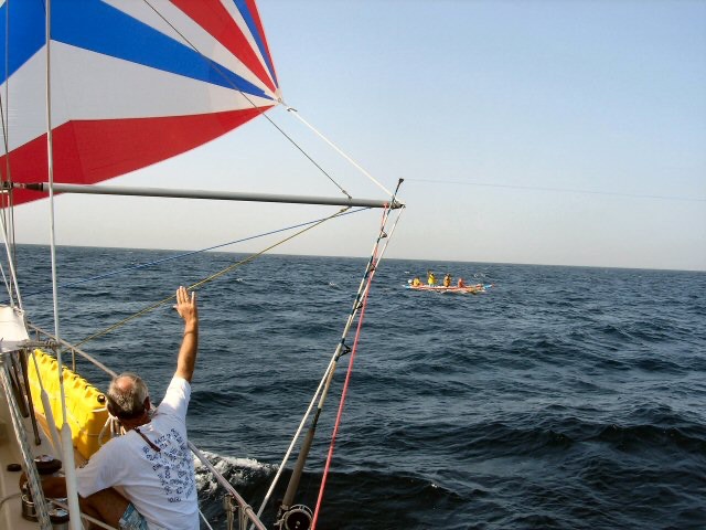Le ciel est bleu limpide, la mer est belle, l'horizon est à nous. En virant le Cap Manuel, nous trouvons une brise de 15 nœuds qui gonfle joliment nos voiles d'avant colorées, nous emportant sur les flots du Grand Océan.