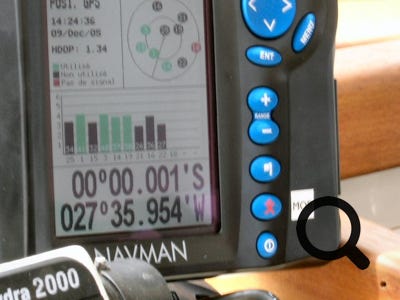 J'ai réduit un peu la toile pour la nuit mais Caramel court toujours 7 nœuds. Sur les 24 dernières heures, nous avons mangé 185 milles. L'équateur approche à grand pas sur la carte. Dans moins de 30 milles, nous y serons. Je sors le colis surprise du congélateur.