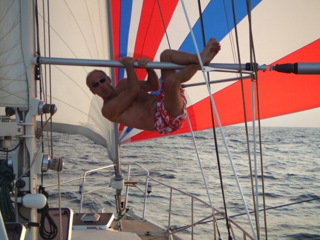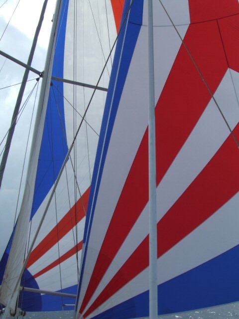 Quel beau spectacle que ces voiles colorées qui poussent le bateau avec grâce. Malheureusement, nous n'avons jamais assez de recul pour en faire de belles photos. Il faut absolument que nous organisions cela dans un proche avenir avec un bateau ami. Didier propose à Alain de faire des photos depuis l'annexe …