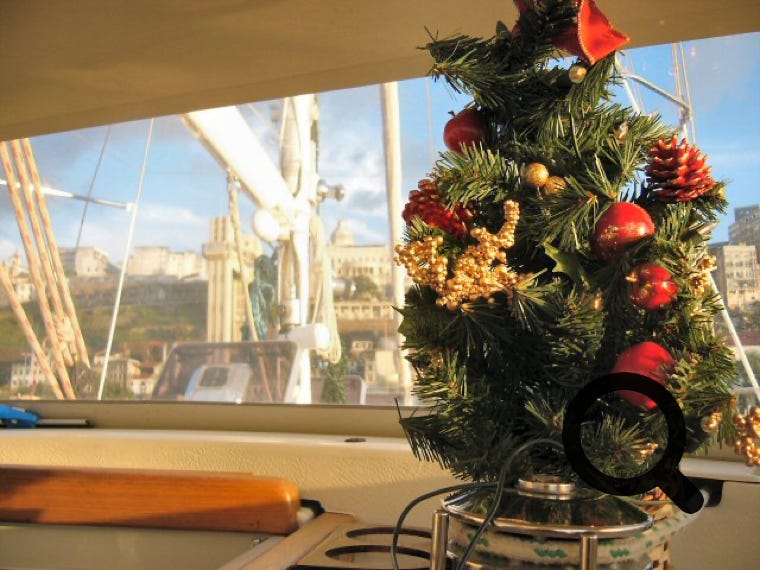 Moi, qui savais ce que j'allais y trouver, je suis aussi heureux qu'eux. La transat n'est certainement pas une fin en soi et ce soir je sais pourquoi je l'ai faite. Les cœurs des chants de Noël et le grondement des tambours du maracatu ont déclenché leurs vagues d'émotions. Il est un peu embué ce soir, le regard du Capitaine.