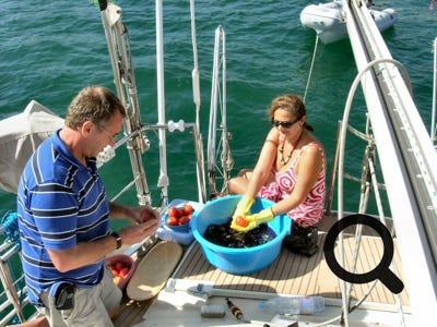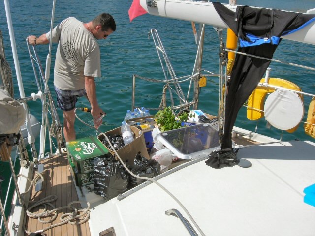 Caramel n'est pas oublié. Le dessaler et le nettoyer est notre première occupation après l'amarrage. La journée passe bien vite malgré ce soleil qui cogne.