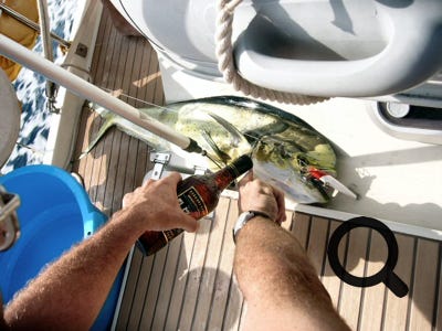 Re-dzzzing, Alain a une grosse touche sur la canne bâbord. Une petite bataille oppose durant dix minutes le pêcheur et une belle dorade coryphène d'un mètre. Gaétan la croche à l'eau et la ramène sur le pont dans la grande bassine bleue, l'antichambre de la mort. Une rasade de rhum vénézuélien dans les ouïes achève son trépas. Avec lui, disparaissent les belles couleurs vertes métallisées du poisson. Rapidement levé en filets, le poisson se retrouve au congelo. Il y a encore du steak dégelé pour ce soir. La pêche est terminée pour aujourd'hui.