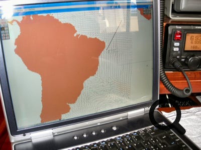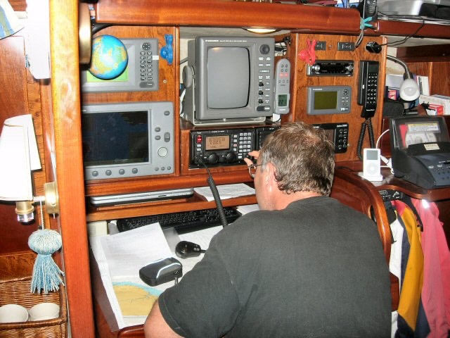 Comme tous les jours, Gaétan se bat avec la radio BLU pour noter la position des autres bateaux. Il apparaît à 09h00 que nous sommes toujours au devant du groupe et que trois bateaux sont encore juste au Nord de l'équateur. A la vacation du soir, nous entendons les équipages des monocoques qui commencent à fatiguer des ces longues journées à la gite dans une mer formée et les équipages des catas qui en ont marre de tout arrimer à bord. Il faut dire qu'ils ont perdu cette habitude.