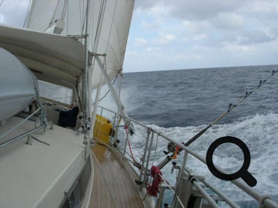 Nous avançons modestement sous nos deux voiles d'avant quand nos trois cannes touchent en même temps. Alain perd sa prise, je remonte une petite bonite et Gaétan s'escrime avec client plus sérieux. Je te remonte, tu me reprends, le petit jeu se termine vite. La ligne devient molle, le fil se rembobine aisément. Plus rien au bout. Alain fait les comptes de la journée : 5 leurres perdus dont le super Rapala gros comme un hareng qui a des couleurs de maquereau et qui siffle comme un colibri. Tout un programme. Chère la pêche !